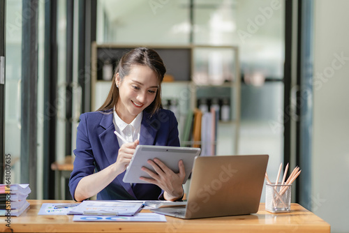 Asian businesswoman working with papers and laptop sitting at table in office, analyzing business accounting calculations and financial planning concepts.