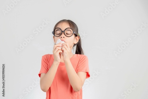 Asian child girl sick with sneezing on the nose and cold cough on tissue paper because weak or virus and bacteria from dust weather