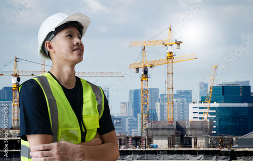Asian civil engineer or architecture,professional worker man wearing white hat looking forward to success,young adult man working at construction site ,Concept work in success.