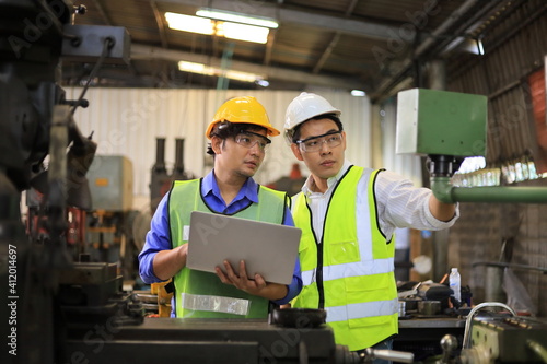 Asian engineering manager and mechanic worker in safety hard hat and reflective cloth using lathe machine inside the factory