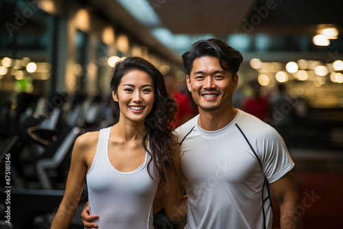 Asian fitness man and woman standing after workout in gym. personal trainer. healthy lifestyle