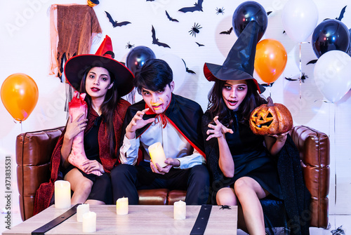 Asian Happy friends sitting on sofa in costumes and makeup on a celebration of Halloween posing with pumpkin and fake human leg in party, Group of young people enjoying Halloween party at home