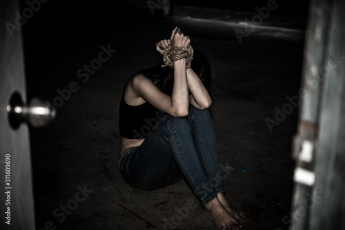 Asian hostage woman Bound with rope at night scene,The thieves kidnapped for ransom,thailand people