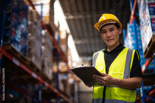 Asian male worker wearing Hard Hat with clipboard Checks Stock and Inventory in the Retail Warehouse.