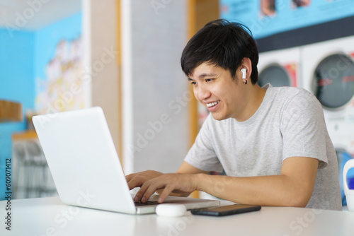 Asian man using laptop or notebook computer for online video conference and entertainment while waiting for his clothes wash in the self-service automatic washing or laundry machine.