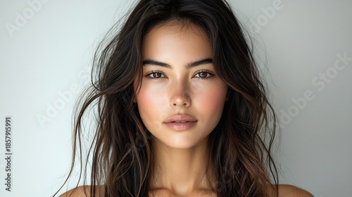 asian, model, 30s, smooth, skin, styled, hair, modern, beauty, studio, cosmetic, care, routine, displayed, gentle, light, calm, mood