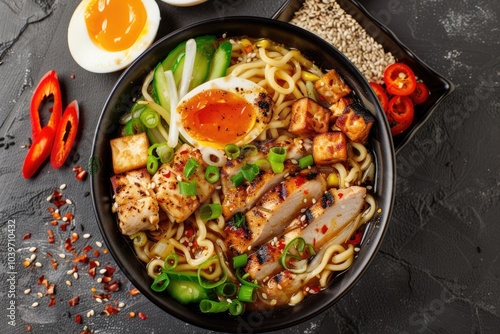 Asian Ramen Soup with Chicken Tofu Vegetables Egg