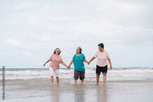 Asian senior females walking on the beach, smiling and enjoying retirement freedom. insurance, life plan, and healthy senior lifestyle.