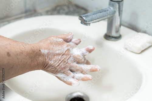 Asian senior or elderly old lady woman patient washing hand by soap and clean water for protect infection and kill Novel Coronavirus (2019-nCoV) Covid-19 virus, bacteria and germs.