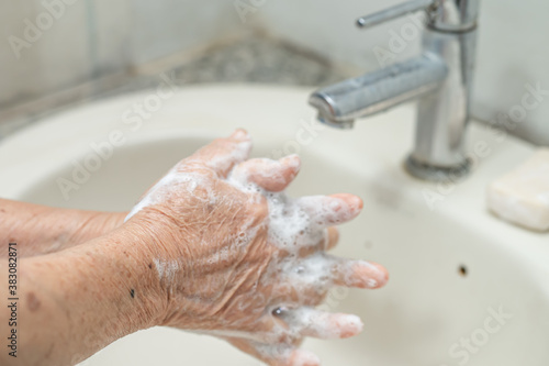 Asian senior or elderly old lady woman patient washing hand by soap and clean water for protect safety infection and kill Novel Coronavirus Covid-19 virus, bacteria and germs.
