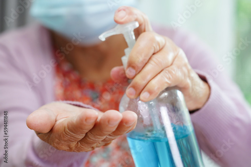 Asian senior woman press blue alcohol sanitizer gel for washing hand protect infection coronavirus..Asian senior woman press blue alcohol sanitizer gel for washing hand protect infection coronavirus.