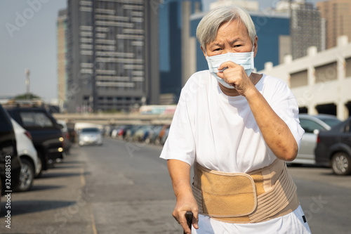 Asian senior woman with protective mask because dirty air,polluted,smog,PM2.5,elderly people wearing face mask to protect respiratory disease outdoor in city street,concept of air pollution,fine dust