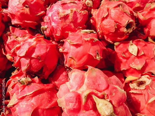 Asian summer organic fruits, fresh dragon fruits, Colorful pink, red fruit are arranged in beautiful line, pattern.