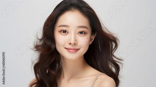 Asian teen with long hair, white T-shirt, in front of a plain white studio, softly lit. AI horizontal copy space on pastel background.