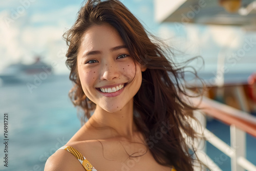 cruise, ship, cruise ship, sea, woman, asian, holiday, journey, young, passenger, travel, tour tourism, sail, ocean, liner, boat, happiness, summer, person, vacation, holiday maker, girl, sunlight, voyage, relaxation, standing, mediterranean, port, transportation, trip, tropics, yacht, deck, sun, tour, hotel, harbor, sky, enjoy, smiling, water, blue
