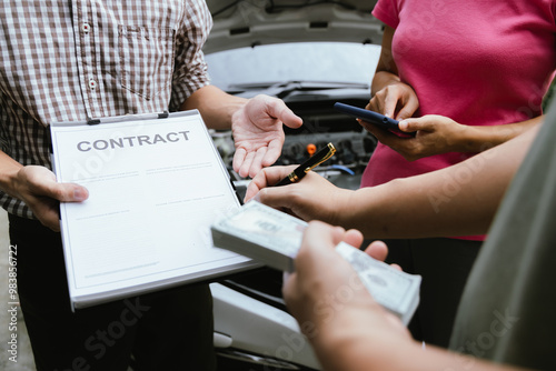 Asian woman involved in car accident, insurance agent and expert analyze the incident to seek compensation, while disgruntled driver argues over the damages caused.