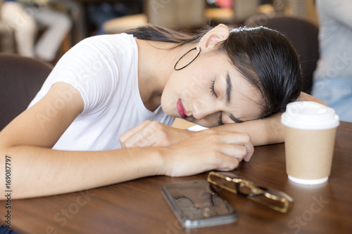 Asian Woman Sleeping at Cafe with Coffee Cup on Desk, Woman Lifestyle Concept.