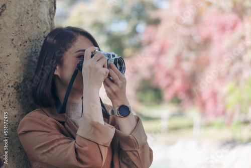 Asian Women with vintage film camera take a photo. Smiling female photographer look at photo from professional camera outdoor. Young woman shooting photo in green nature park. Beautiful woman hobby