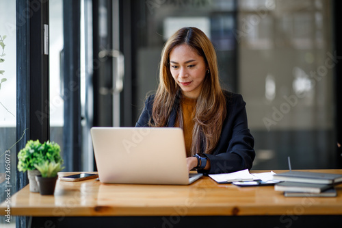 Asian young businesswoman sitting at a table with laptop computer and doing math finance report on wooden desk, tax, accounting, statistics and analytical research concept