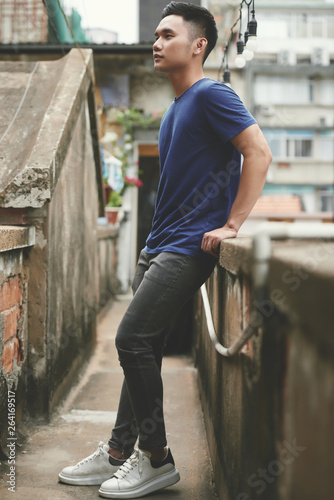 asian, adult, casual attire, city, ethnicity, fashion, photogenic, lifestyle, man, model, 1, pensive, people, person, portrait, serious, standing, style, thinking, urban, young, trendy, season, summer