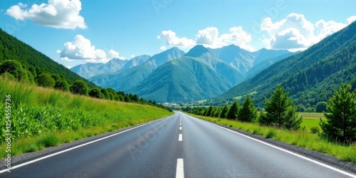 Asphalt ribbon unwinding through verdant valleys towards majestic mountain peaks under a vibrant summer sky
