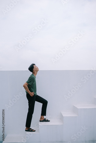 young, man, stair, climbing, looking, forward, challenge, progress, future, aspiration, minimal, minimalist, white, growth, success, journey, ambition, achievement, development, motivation, step, perspective, architecture, outdoors, day, sky, casual attire, attire, confident, vision, inspiration, determination, advancement, path, pathway, endeavour, career, goal, lifestyle, direction, exploration, discovery, potential, horizon