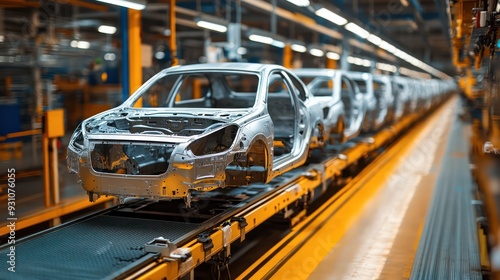 Assembly line in an automotive factory, with car bodies moving through various stages of production.