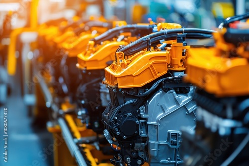 Assembly line of car engines, robotic precision, workers overseeing the process, metallic tones. [Engine Assembly, Car Manufacturing]
