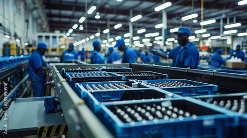Assembly line, where workers in blue uniforms assemble various components. The conveyor belt is filled with different parts