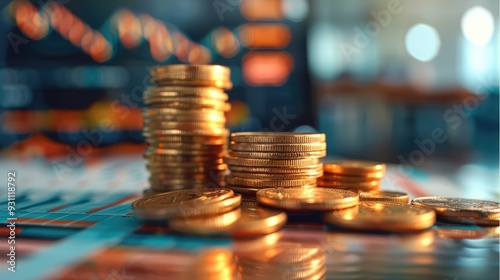 Asset allocation planning, investment charts, pile of coins, focus cover all object. Generative AI.