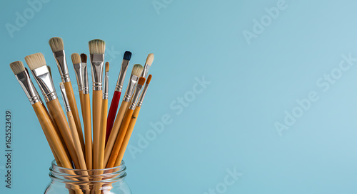 Assorted artist paintbrushes in glass jar on light blue background with ample copy space.