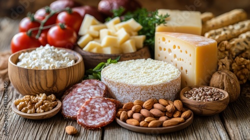 cheese, food, nut, meat, healthy, diet, snack, meal, breakfast, lunch, dairy, cured, vegetable, rustic, wooden, table, arrangement, delicious, closeup, ingredient, selection, variety, italian, europa, food photography, composition, natural, epicure, healthy eating, artisanal, background, dietary, tasty
