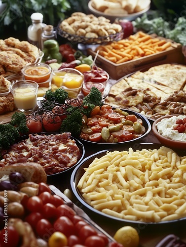 Assorted delicious comfort food feast with pizza and appetizers : Generative AI