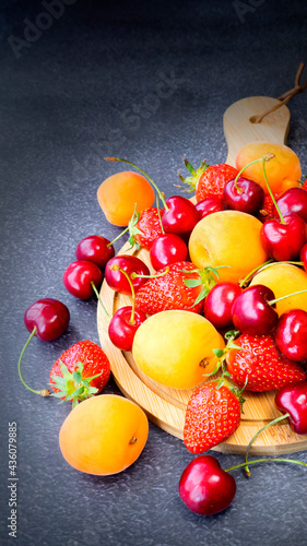Assorted different fruits and berries: strawberries, cherries, apricots. Image with selective focus