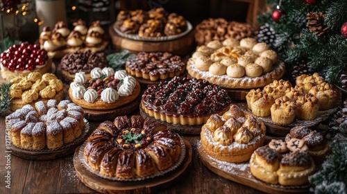 Assorted Festive Pastries and Desserts on Display with Decorative Elements and Copy Space