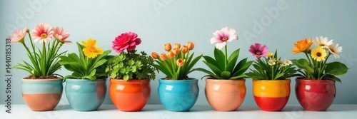 Assorted flowering plants in colorful ceramic pots , colorful, geranium, botanical