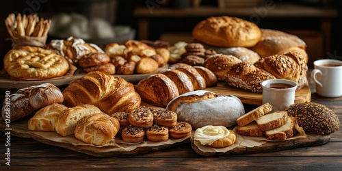 Assorted fresh baked goods including bread, pastries, and cookies on wooden table