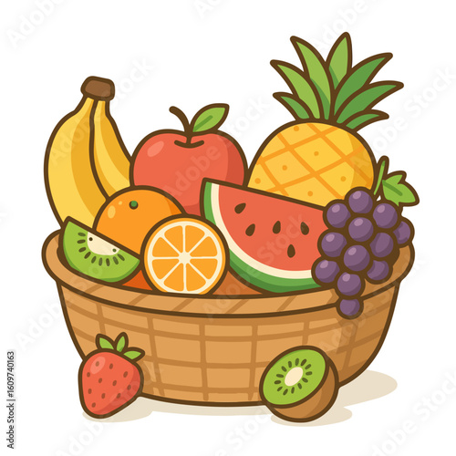 fruit basket, fruit, assortment, fresh, healthy, mix, variety, apple, orange, banana, watermelon, grape, kiwi, pineapple, strawberry, wholesome, food, gift, cartoon, graphic, isolated, white background, vector, illustration