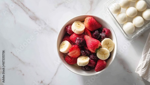 fruit, salad, bowl, strawberry, raspberry, banana, cherry, healthy, fresh, vibrant, colourful, mix, delicious, alimentary, food, ingredient, breakfast, snack, summer, spring, dessert, topping, plate, white, marble, top, view, food photography, light, tasty, healthy eating, vitamin, antioxidant, wholesome, appetising, refreshing, sweet, juicy, organic, natural, diet, lifestyle, simple, easy, receipe, presentation, display