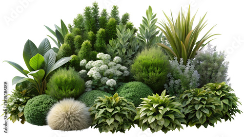 Assorted Green Plants and Bushes Arrangement Isolated on Transparent Background on white background
