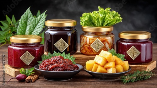Assorted homemade fruit preserves and fermented vegetables in glass jars on rustic wooden table with fresh herbs and ingredients