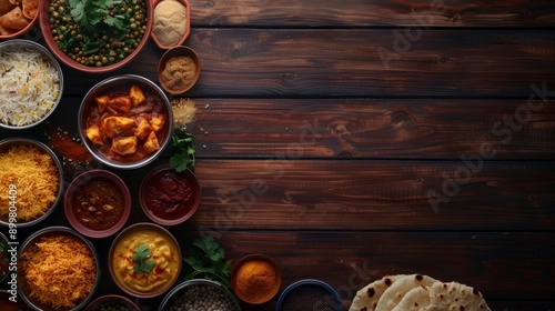 Assorted indian food on dark wooden background. Dishes of indian cuisine. Curry, butter chicken, rice, lentils, paneer, samosa, naan, chutney, spices, Bowls and plates with indian food, copy space