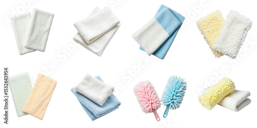 Assorted microfiber cloths and duster rags in various colors isolated on transparent background ideal for cleaning and personal care applications