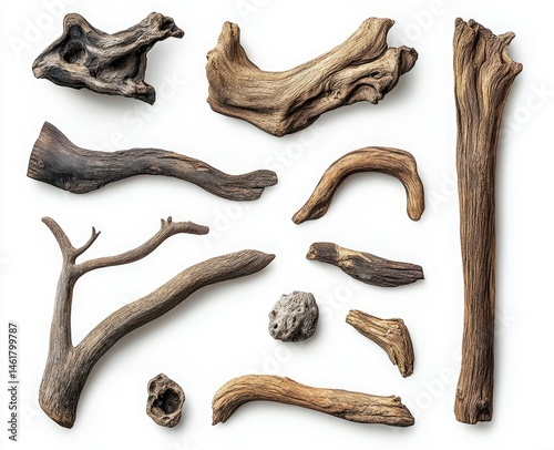 Assorted pieces of driftwood, various shapes and sizes, arranged on a white background. Different textures and shades of wood, with some pieces showing signs of weathering