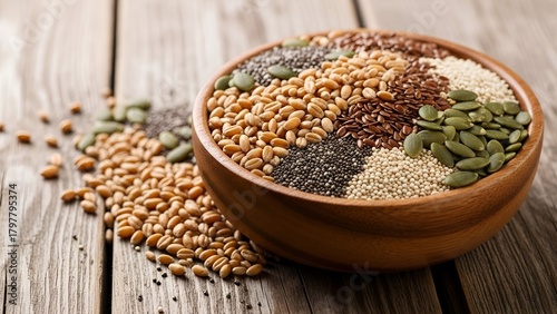 Assorted Seeds in Wooden Bowl on Wooden Surface with Natural Lighting