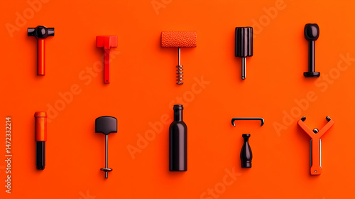tool, utensil, orange, background, black, hammer, mallet, corkscrew, ice cream, bottle, opener, plier, wrench, screwdriver, clamp, equipment, accessory, kitchen, cooking, dining, bar, party, camping, industrial, supply, construction, work, handyman, home, repair, maintenance, functional, design, minimalist, geometric, modern, three-dimensional, illustration, object, red, various, display