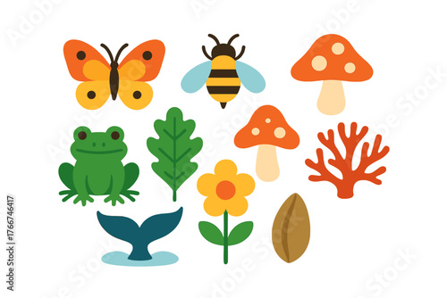 nature, icon, butterfly, bee, frog, mushroom, flower, leaf, coral, animal, insect, plant, wildlife, botanical, set, collection, ecology, forest, garden, nobody, simple, cute, colourful