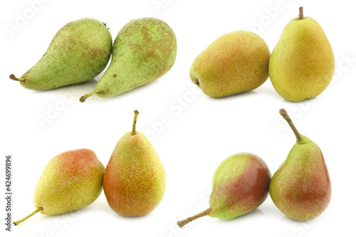 Assortment of different colorful pears on a white background