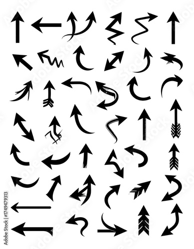 Assortment of directional arrows in varied shapes and styles, black on white