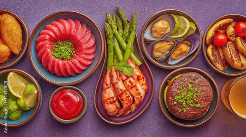 Assortment of fresh seafood and vegetable dishes including sashimi lobster oysters shrimp and vegetables served on dark plates with vibrant colors and garnishes